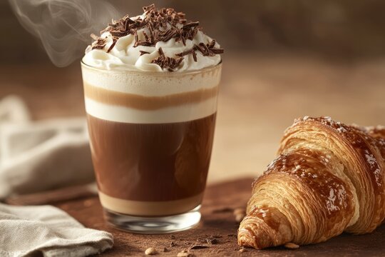 Layered coffee drink topped with whipped cream and chocolate shavings served with a croissant.