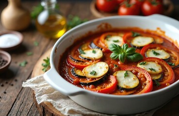 Delicious baked ratatouille dish with tomatoes eggplant zucchini mozzarella cheese and basil. Cooked provencal meal on wooden rustic table. Healthy vegetarian food with natural organic ingredients.