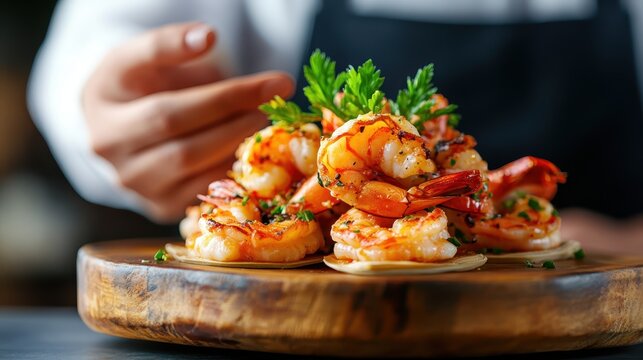 Deliciously plated grilled shrimp arranged beautifully on wood, accompanied by fresh garnishes, embodying culinary mastery and ready to delight gourmet food enthusiasts.
