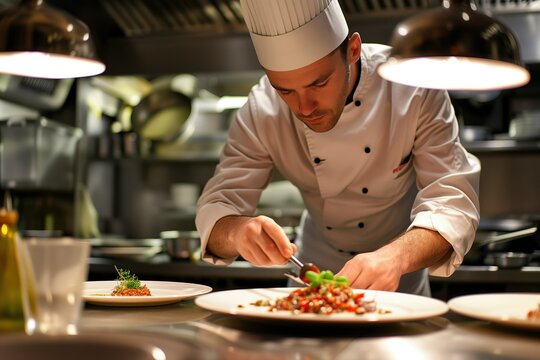Chef garnishes exquisite dish, showcasing culinary artistry and passion for haute cuisine. Ideal for highlighting fine dining, gastronomy expertise, and sophisticated process of creating gourmet food