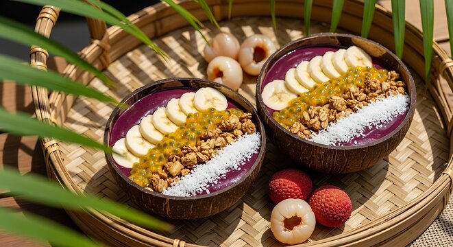 Fresh passion fruits sliced open on a woven tray, with whole fruits and greenery in a bright kitchen