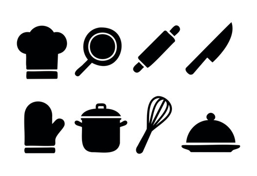 Various kitchen tools are displayed including a chef's hat, rolling pin, knife, pot, and whisk, showcasing essentials for cooking and meal preparation.