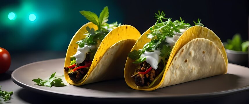 An artistic presentation of tacos with seasoned beef, fresh pico de gallo, creamy guacamole, and a sprinkle of cheddar cheese,