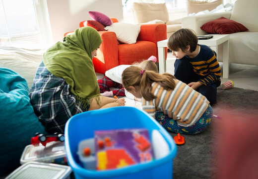 Vier Kinder am Spielgeraet in Krippe oder Kindergarten. High quality