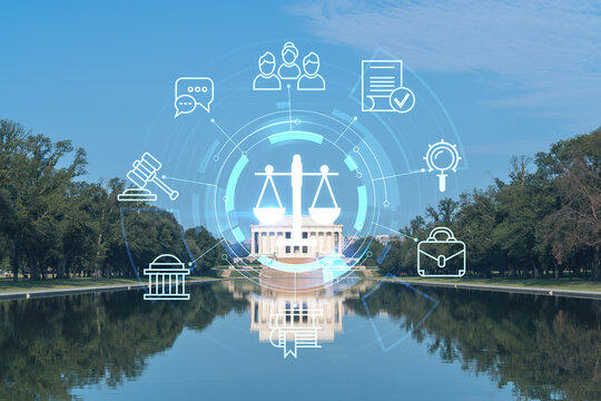 Iconic Lincoln Memorial, Washington DC, USA. Seen from reflecting pool. American politics, governmental bodies. Glowing hologram legal icons. The concept of law, order, regulations and digital justice