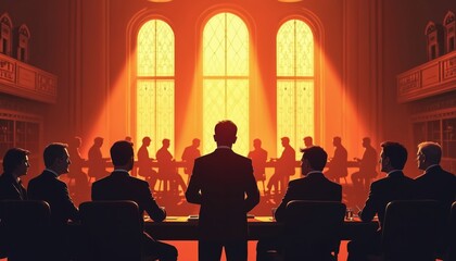 Men in suits at large table in grand hall. They discuss policy near tall arched windows letting in light. Leaders meet for important governmental or corporate session.