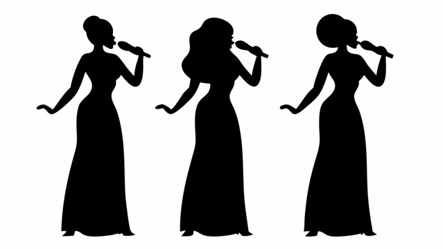 Three silhouette women in long gowns singing into microphones with different hairstyles in black and white | editable eps vectors