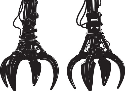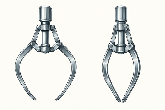 Opened and Closed Chrome Machine Claw Hand isolated on a white background. Robotic Claw Hand in different positions.