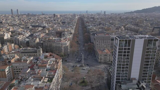 flying forward high over Paseo de Gracia in Barcelona Spain