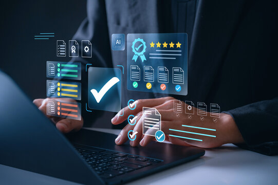 Certification and quality assurance concept. businessman using digital checklist and rating stars and quality control document, workflow validation, compliance tracking and audit process management
