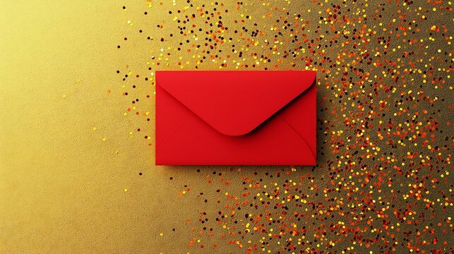A single vibrant red envelope placed centrally on a luxurious golden gradient background with a clean simple text placeholder area  This 3D digital showcases a modern