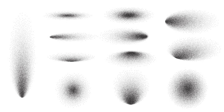 Dot grain noise gradient pattern shape set. Abstract oval and round elements with shadow spray sand effect. Vector illustration isolated on white background