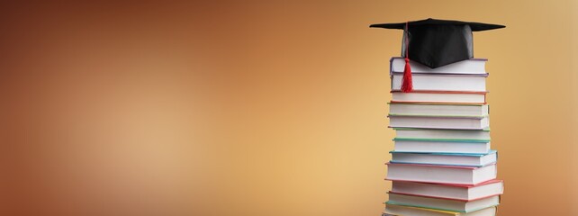 Stack school books with black graduation hat