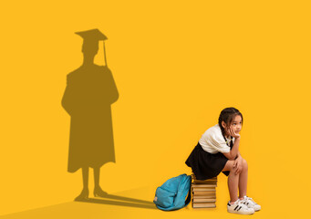 Pensive Asian schoolgirl sitting on stack of books, dreaming of college graduation, shadow of university student on wall