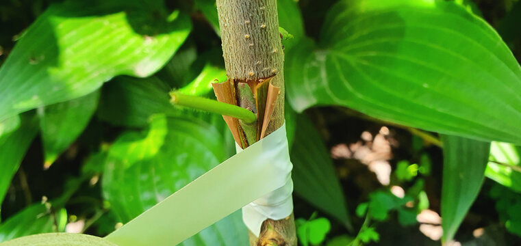 Close-up grafting on a fruit tree in spring.