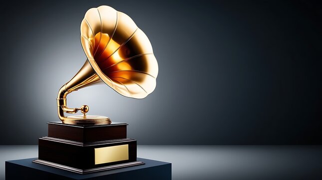 Grammy award concept, A gleaming golden trophy stands atop a black pedestal against a dark green background, symbolizing achievement and excellence in the music industry.