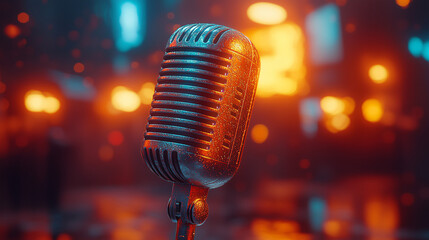 Classic microphone in dramatic lighting with warm background