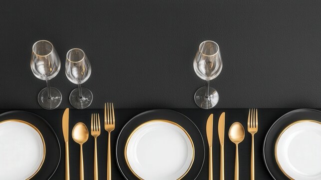 Grammy award concept, A stylishly arranged dining table featuring black plates, gold cutlery, and elegant glassware set against a dark backdrop.