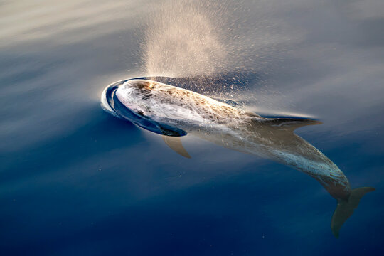 Risso's Dolphin - (Grampus griseus) in mediterranean sea at sunset
