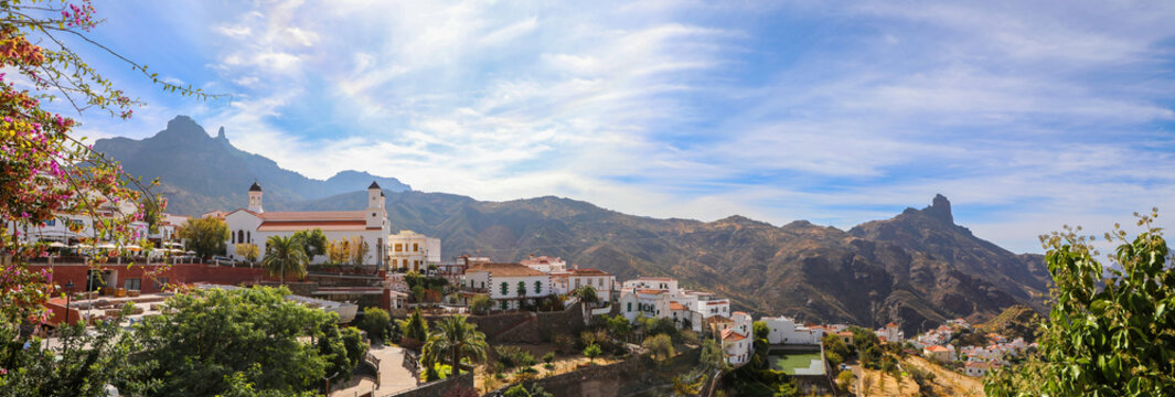 Panoramic view of the white village of Tejeda and Roque Bentayga in Gran Canaria