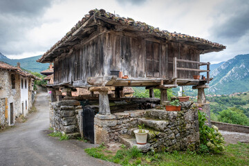 Traditional Asturian granary in the town of Valdebarzana. Spain.