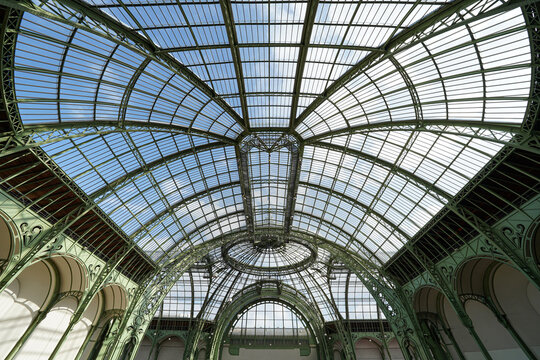 Top down aerial shot of historic site The Grand Palais des Champs-Elysees of Paris, a large exhibition hall and museum complex with glass roof top in morning, featuring french flag on the dome .
