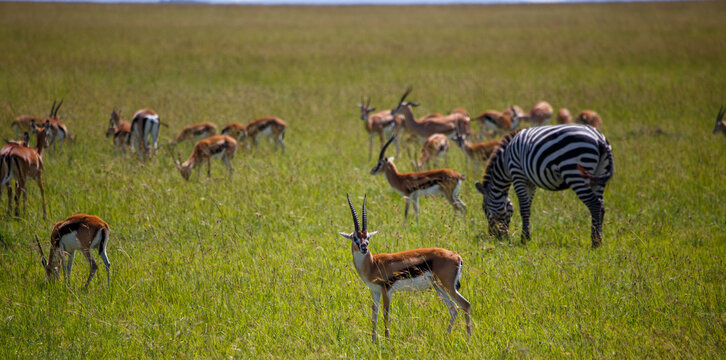 Macho de gacela con grandes cuernos liderando su manada en la llanura de Masái Mara, Kenia