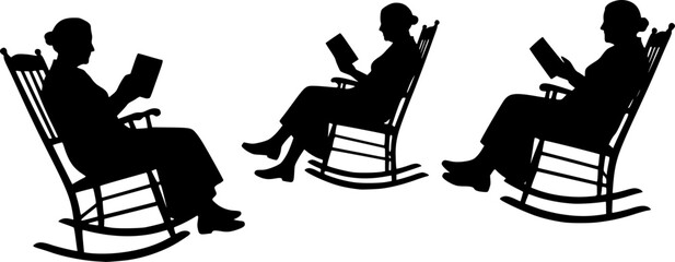 Old Woman Reading Book In Rocking Chair silhouette vector illustration isolated on white background