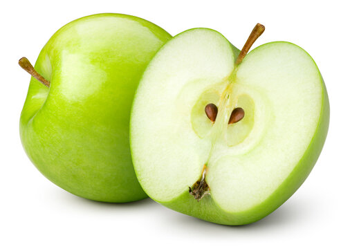 Green apple isolated. Whole apple and a half on white background. Green apples with clipping path. Full depth of field.