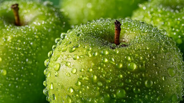 Crisp Granny Smith apples with refreshing water droplets, perfect for healthy eating campaigns or vibrant food product promotions that convey freshness