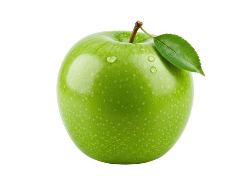 Isolated green apple with leaf and water droplets, perfect for healthy food concepts