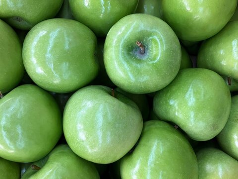 Full frame, background of shiny Granny Smith apples (fresh green apples).