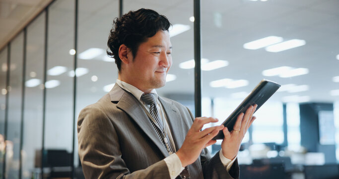 Business, man and smile with tablet in office for portfolio management, funding proposal review and feedback. Japanese firm, budget analyst and digital technology for contract agreement and solution