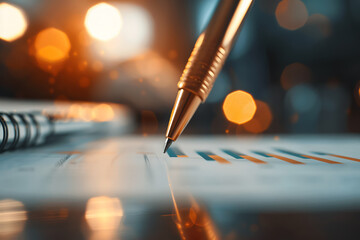Close-up of a pen writing on paper with chart, warm bokeh lights in the background, signifying data analysis and business strategy.
