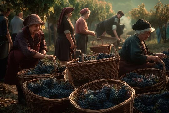Woman farmer winemaker cutting and picking ripe grape bunches from vines during wine harvest season. The harvesting of wine grapes in winemaking