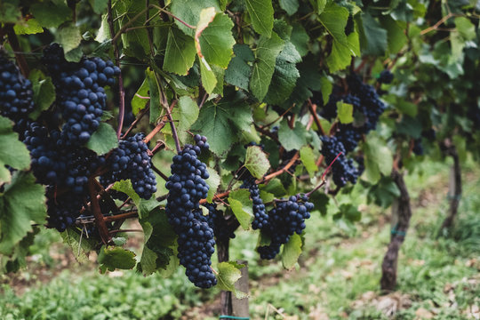 A cluster of grapes grows on a vine in a scenic vineyard, surrounded by blooming flowers, trees, and a clear blue sky, creating a picturesque natural landscape