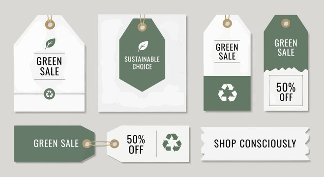 Eco-friendly shopping tags with green sale and 50% off promotions plus recycle symbols, showcasing sustainable choice messaging for conscious consumers