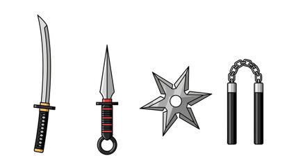 Vector set of kunai knives, iconic ninja weapons in outline and solid styles. Perfect for games, anime, martial arts, weapon icons, or Japanese culture designs.