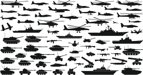 Collection of black silhouette military vehicles aircraft and weapons army navy