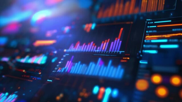 A vibrant financial data display shows fluctuating stock market graphs and charts.