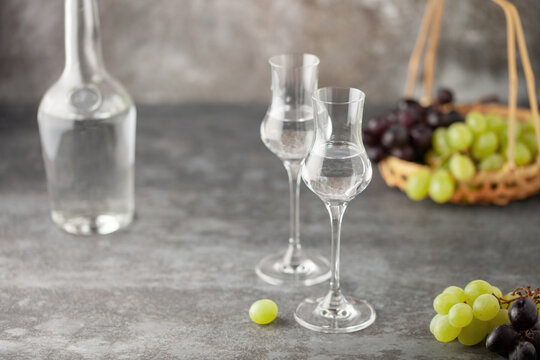 Grape vodka or grappa. Strong alcoholic drink in grappa glasses on the table. Fresh grapes