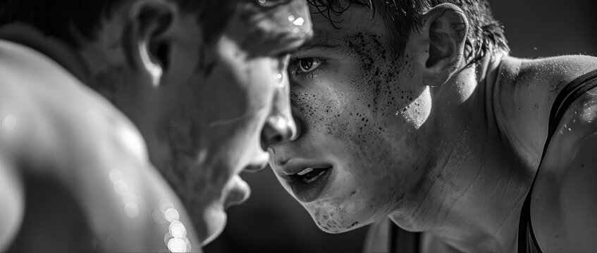 Sweat glistens on the determined faces of two wrestlers as they grapple for control in the center of the ring.