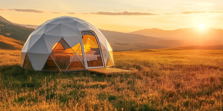 Glamping geodesic dome tent under sunset in scenic mountain landscape