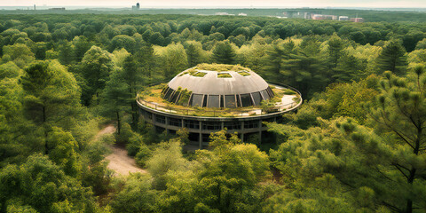 Futuristic domed houses. Eco village glamping. Green grass. Generative AI technology