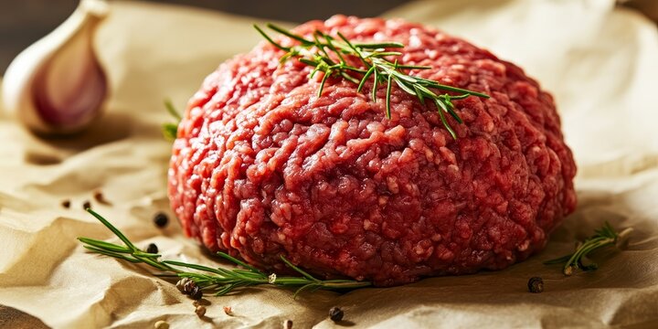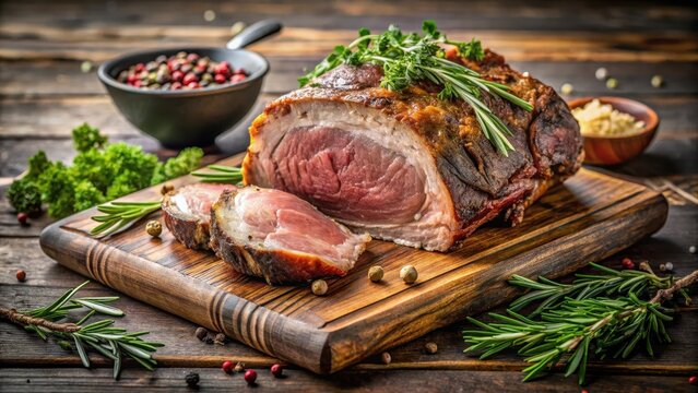 A juicy homemade grass fed prime rib roast on a wooden cutting board with fresh herbs and spices, meat, homemade,  meat