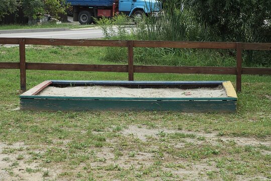 one square wooden sandbox with white sand in green grass on the street near the brown fence