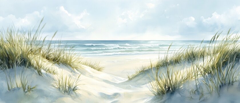 Serene watercolor painting of a sandy beach with dunes and sea grass under a cloudy sky, evoking tranquility and coastal beauty