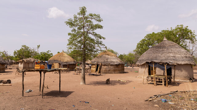 North Ghana traditiona bush grass hut village Panorama. Northern region of Ghana. Rural traditional mud and straw huts and buildings. Poverty economy. African tribal and native homes.
