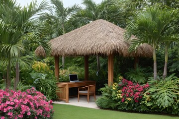 Laptop sitting on wooden desk in tropical tiki hut