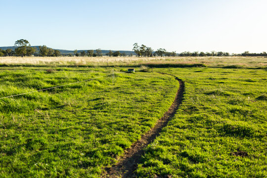 Panoramic view of a large grass field with a well-tended neat lawn against the blue sky. Background texture of grass and trees in a park with vast vacant open space on a sunny day. Copy space for text